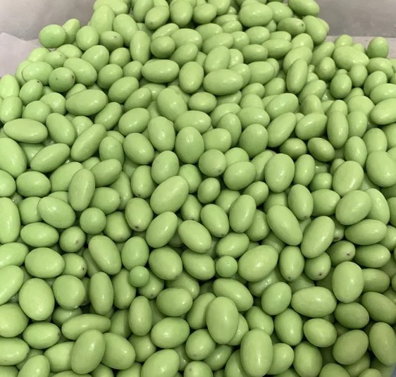 Crunchy roasted almonds coated with smooth chocolate and infused with a refreshing pista flavor, offering a nutty, chocolaty indulgence in every bite.